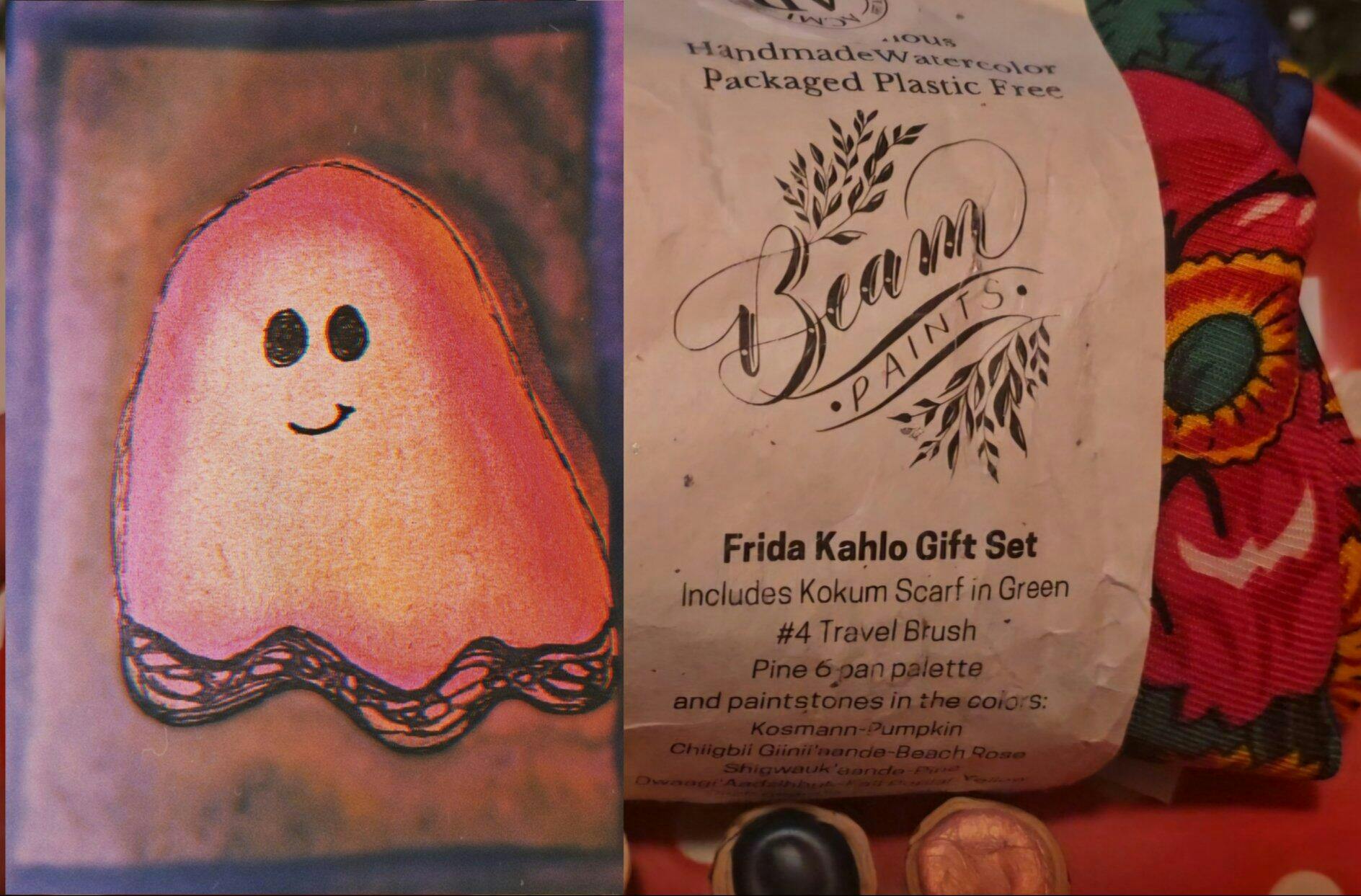 Inspired by the incomparable patron saint of women artists, Frida Kahlo. Magnificent artist whose home was casa azul, who graced the cover of vogue Paris with a straight on gaze that went down in history. Also an artist in her personal appearance, bringing indigenous influence from her life to her canvases to her hair and dress. We honour her with these colors calling to mind the vivid lushness of her paintings, pairing them with a pine palette and a Kokom scarf or the 4 colors with a Kokom hair bow. Kokom Scrunchies is an Indigenous youth owned business making hair adornments that help us bring out our inner Frida!
