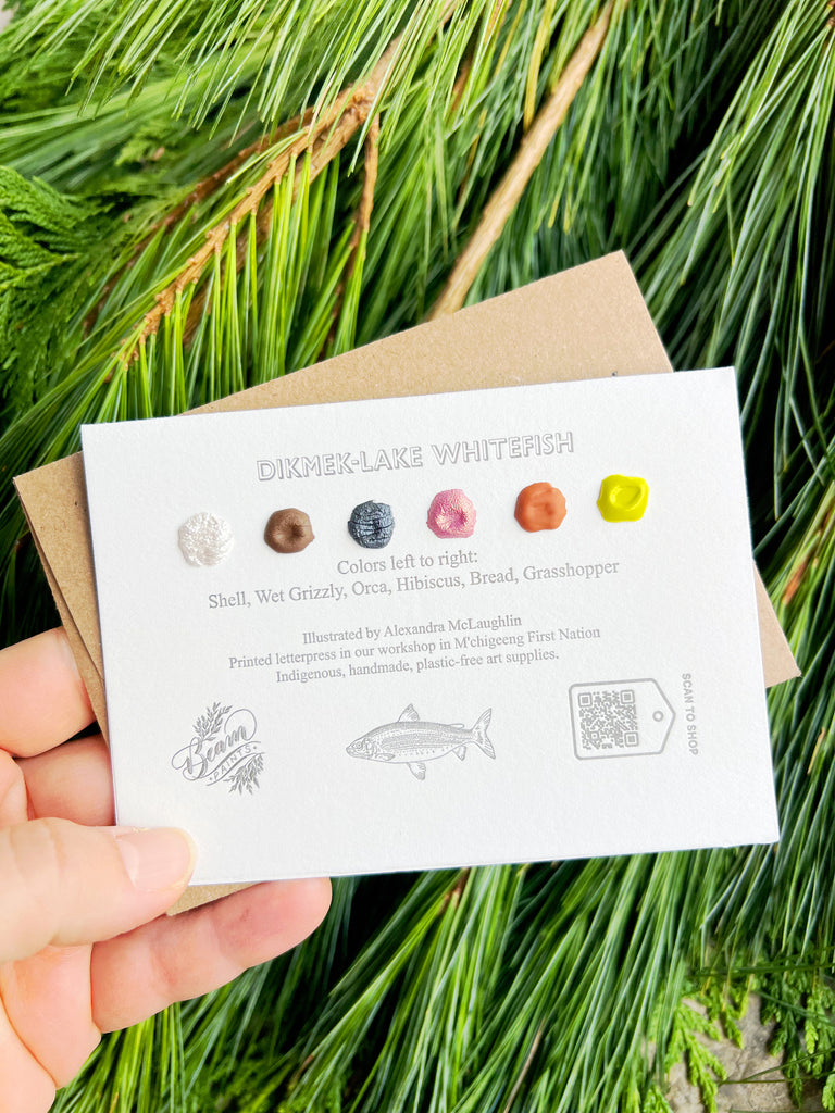Write your own fish tale, in this super cute 3.5”x5” paintable! Printed in our workshop in M’Chigeeng First Nation on a Heidelberg Windmill Letterpress. Paints include Shell, Wet Grizzly, Orca, Hibiscus, Bread, Grashopper, comes with Kraft envelope